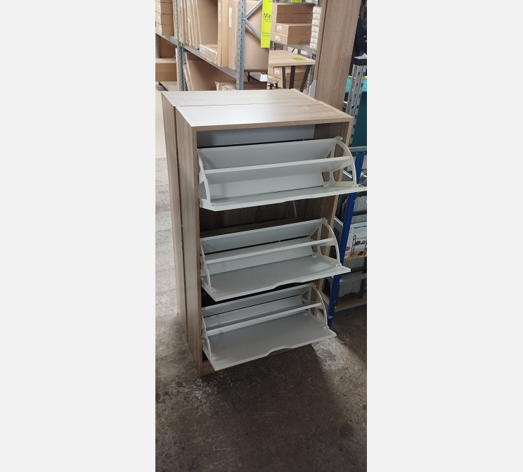 - Meuble à chaussures blanc et chêne, 3 portes.